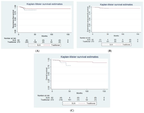 Probabilities of (A) recurrence-free survival, (B) endometrial cancer-specific survival, and (C) overall survival between the traditional lymphadenectomy and sentinel lymph node mapping groups in women with clinically uterine-confined endometrial cancer (n = 334).