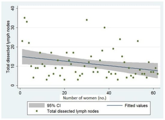 The total number of dissected pelvic lymph nodes versus the number of women in the SLN mapping group is shown in Figure 3. In most cases, the total number of dissected pelvic lymph nodes was under 20 (Figure 3).