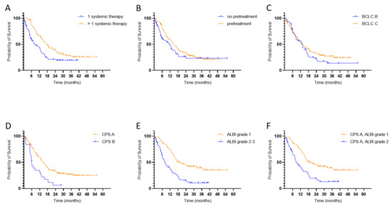 Kaplan-Meier curve of the median overall survival (mOS). (A) 1 therapy line vs. >1 therapy line (mOS 1 therapy line 258 days; mOS >1 therapy line 537 days; p value 0.0007); (B) prior locoregional therapy (mOS no pretreated patients 343 days; mOS pretreated patients 451 days; p value ns); (C) BCLC B vs. BCLC C (mOS BCLC B 404 days; mOS BCLC C 398 days; p value ns); (D) patients with CPS A vs. patients with CPS B at baseline (mOS CPS A 451 days; mOS CPS B 182 days; p value 0.0005); (E) patients with ALBI grade 1 vs. patients with ALBI grade 2 at baseline (mOS ALBI grade 1 567 days; mOS ALBI grade 2–3 243 days; p value < 0.0001). (F) Patients with CPS A and ALBI grade 1 or ALBI grade 2 at baseline (mOS CPS A, ALBI grade 1 567 days; mOS CPS A, ALBI grade 2 265 days; p value < 0.0001).