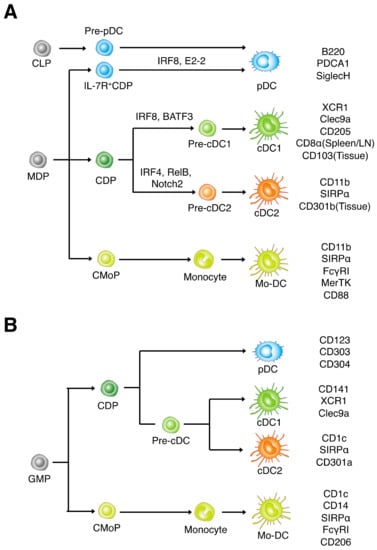 Both human cDC1s and cDC2s are thought to be evolutionarily conserved with the corresponding mouse cells, and they express CD11c and MHC class II. However, the molecules that specifically identify human cDC subsets differ in part from those in mice. In humans, cDC1s are identified by expression of CD141 (BDCA3) in addition to CLEC9A and XCR1 (Figure 1B) [40,41]. Human cDC2s are identified by preferential expression of CD1c (BDCA1) and CLEC10A (CD301a) in addition to SIRPα [41]. Human cDC subsets develop from bone marrow-derived progenitor cells. Human CDPs have the unique potential to give rise to DC lineage cells, with most of these progenitors having unipotent fates for pDCs, cDC1s, or cDC2s [42,43]. In peripheral blood, CD45RA+CD123+ cells include a precursor fraction for cDC1s and cDC2s [44]. Furthermore, HLA-DR+CD141−AXL+SIGLEC6+ cells include pre-cDCs that mainly differentiate into cDC2s [45]. BATF3 is also highly expressed in human cDC1s and critical for the generation of cDC1s in vitro [17]. Studies of individuals with heterozygous mutations of IRF8 revealed that IRF8 is required for the development of DC lineage cells, particularly for that of cDC1s [46]. Human pDCs uniquely express CD123 (IL-3R), CD303 (BDCA2), and CD304 (BDCA4). A recent study revealed that human pDCs can be subdivided into several populations in the context of antigen presentation and type I IFN production, particularly in response to pathogen stimulation [47].