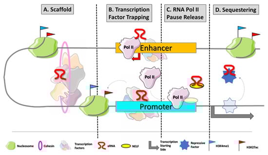 eRNA biogenesis and frequently described modes of action. Enhancers are typically disengaged of nucleosomes which makes their DNA sequences easily accessible for transcription factor (TF) binding. Master TFs occupy enhancer regions at specific DNA motifs to initiate the transcriptional process by recruiting RNApol II at enhancers. Those transcripts mainly promote gene expression by different mechanisms of action: (A) eRNAs can interact with transcription factors to support proper enhancer–promoter loop formation [8,9]. (B) eRNAs participate in TF trapping, RNApol II loading, and histone modification [10]. (C) eRNAs can assist RNApol II pause release by binding negative elongation factor (NELF) [11]. (D) eRNAs can act as decoys for repressive co-factors of transcription which would bind at the respective target genes.