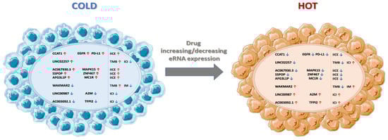 Cold tumors and the potential role of eRNAs. Some tumors are defined as cold tumors due to their capacity in evading a strong immune response with a tumor microenvironment, which suppresses tumor infiltrating T cells. The figure summarizes the growing literature sustaining the role played by eRNAs in immune escape of tumor cells. Increasing or decreasing the expression of specific eRNAs by novel drugs might switch cold tumors to hot tumors and improve current anti-cancer therapies in combined treatments. ICI = immune cell infiltration; IICE = inhibitor immune-checkpoint expression; IM = immuno-modulation; TMB = tumor mutational burden.