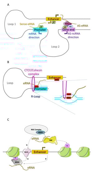 New insights in cis transcriptional regulation mediated by eRNAs. (A) In prostate cancer, AS-eRNAs regulated by androgen receptor (AR) can recruit DNMT1 to the 3′ of AR-related target genes, suppressing tail-to-tail antisense transcription and enhancing mRNA expression. Here, the chromatin establishes a double-loop, which enables spatial targeting of sense-eRNA and AS-eRNA to the promoter or gene-end in cis, respectively [92]. (B) The enhancer–promoter interaction, in presence of similar Alu sequences, is sustained by eRNAs directly interacting with their targeted promoters by structures, called trans-acting R-loops [93]. (C) eRNAs contribute to the maintenance of enhancer activation by direct interaction with CBP and BRD4, increasing histone acetylation and consequently BRD4 binding to acetylated histones [103,104]. This feed-forward loop promotes RNApol II elongation and eRNA transcription. Additionally, Ago1 controls gene expression and differentiation by the eRNA-mediated interaction with CBP and consequent regulation of H3K27ac. Ago1 also mediates the recruitment of RNApol II to activated enhancers [106].