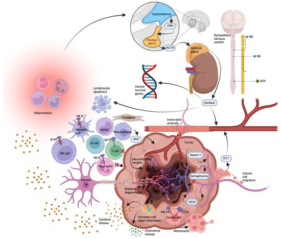 Recent findings have implicated bidirectional nervous/immune pathways in a variety of neurological and psychiatric pathologies [89,90,91,92], and many cell types are known to contribute to a cancer-supportive tumor microenvironment, including cancer-associated fibroblasts, myeloid-derived suppressor cells, T and B regulatory cells, regulatory dendritic cells, tumor-associated alternatively activated type 2 macrophages and type 2 neutrophils, and some mast cells, all of which facilitate immunosuppression and tolerogenicity [93,94]. Neurotransmitters, particularly those involved in stress reactions, have been shown to impair the functions of several leukocyte subsets. For example, ligands of β-adrenergic receptors inhibit the cytotoxic activity of natural killer cells [95,96]; norepinephrine impairs several functions of dendritic cells [97] and inhibits the migration of neutrophil granulocytes [98]; and substance P provides an anti-adhesive signal for T cells [99]. The nervous system therefore influences the immune system, and immunosuppression by the nervous system through strong adverse experiences (e.g., chronic stress, anxiety, or depression) may facilitate tumor development [100]. Ahmad et al. have highlighted the following vicious cycle: cancer stimulates pro-inflammatory cytokines; neuroinflammation ensues; neuroinflammation hyperactivates the hypothalamic-pituitary-adrenal (HPA) axis; the dysregulated HPA axis increases cortisol; depression ensues; depression leads to immunosuppression and cancer progression [101].