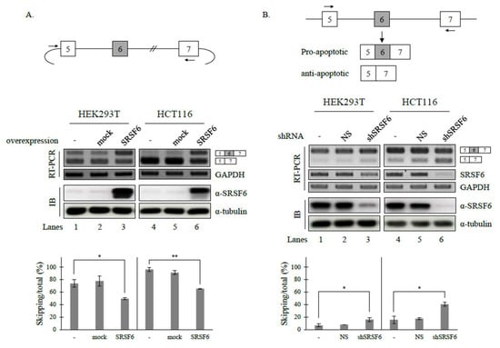HCT116 (Korean Cell Line Bank, 10247, Seoul, Korea) cells and HEK293T (American Type Culture Collection, CRL-3216, Manassas, VA, USA) cells were cultured in Roswell Park Memorial Institute Medium (RPMI) or Dulbecco’s Modified Eagle’s Medium (DMEM), and supplemented with 10% fetal bovine serum (FBS, Logan, UT, USA), 2 mM glutamine, 100 iU/mL penicillin, and 100 μg streptomycin at 37 °C in a 5% CO2 incubator, as previously described [47]. The transfection of plasmids into cells was performed with polyethylenimine (PEI) reagent (Sigma, St. Louis, MO, USA). Then, 1 μg of plasmid DNA was mixed with 2 μg of PEI in 100 μL of DMEM, then applied to cells in 1 mL DMEM. Four hours later, the media were replaced with 10% FBS containing DMEM media. RNA extraction was performed at 48 h post-transfection, as previously described [48]. The anti-SRSF6 shRNA-virus was prepared by transfection of the SRSF6-shRNA plasmid (clone ID: TRCN0000006621 and clone ID: TRCN0000006622) (Horizon), a packaging vector (psPAX2, Addgene, Watertown, MA, USA), and an envelope vector (pMD2.G, Addgene, Watertown, MA, USA). The virus-containing supernatant was filtered with a 0.45 μm filter. Virus infection was performed with 5 mg/mL polybrene (Sigma, St. Louis, MO, USA), as previously described [47].