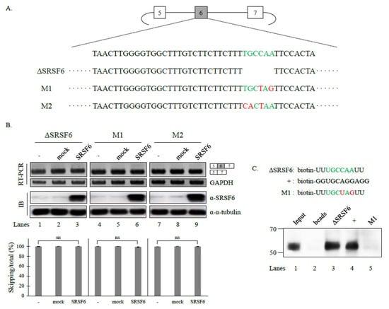 Immunoblotting was performed as described previously [42]. In detail, cells were lysed with lysis buffer (1% Triton X-100, 50 mM Tris-Cl pH 7.5, 150 mM NaCl, 5 mM EDTA, 1 mM beta-mercaptoethanol) for 2 h at 4 °C. The supernatant was used for immunoblotting analysis with an anti-SRSF6 antibody (Millipore, MABE152, Burlington, MA, USA). The RNA-pulldown assay was performed based on the covalent linkage of streptavidin agarose beads with chemically synthesized 5′-biotin-labeled RNAs followed by incubation with cell lysate, as previously described [49]. SDS-PAGE loading buffer was added to the streptavidin agarose beads and boiled, followed by 10% SDS PAGE gel. Proteins were then analyzed by immunoblotting with an anti-SRSF6 antibody [49].