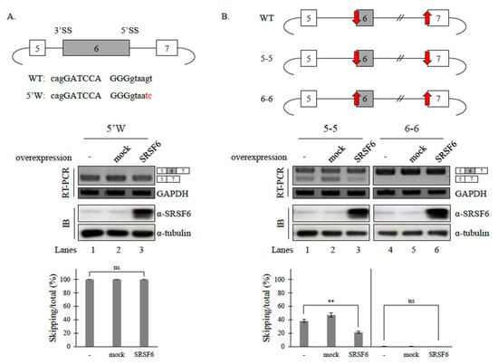 5′ splice-site (5′SS), but not 3′ splice-site (3′SS), strength affects SRSF6 function on Fas pre-mRNA splicing. (A) (Upper) Schematic representation of the 5′W minigene. Mutated sequences are shown in red. (Middle) RT-PCR analysis of the 5′W minigene with RNAs from untreated, empty vector-treated, and SRSF6-overexpressed cells with GAPDH as a loading control. Immunoblotting of these cells with anti-SRSF6 antibody was also performed with α-tubulin as a loading control. (Lower) Statistical analysis graphs of RT-PCR with p values. (B) (Upper) Schematic representations of WT, 5-5, and 6-6 minigenes. Stronger and weaker 3′ splice-sites are indicated by upper and lower arrows, respectively. (Middle) RT-PCR analysis 5-5 and 6-6 minigenes with RNAs from untreated, empty vector-treated and SRSF6-overexpressed cells. (Lower) Statistical analysis graphs of RT-PCR with p values. Standard deviations (SD) calculated from three independent experiments are indicated by error bars: ** p < 0.01, ns p > 0.05. Uncropped figures are shown in Supplementary Figure S3.