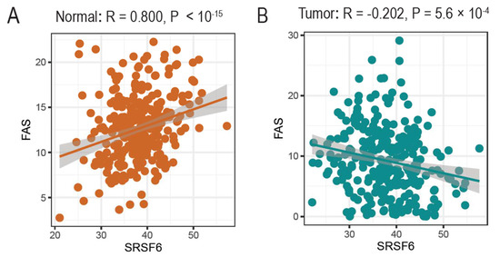 The co-expression landscape of SRSF6 and Fas genes varies between normal and tumor transcriptomes. Based on SRSF6 and FAS gene expression (TPM units), we explored their co-expression landscape in (A) normal colon samples from the GTEx database, and (B) tumor samples of colon cancer from the TCGA database. Interestingly, SRSF6 and Fas genes were positively co-expressed in normal colon samples (R = 0.800), whereas they were negatively co-expressed in tumor samples (but weaker than the normal samples) (R = −0.202).
