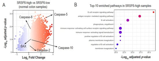 SRSF6 expression in normal samples promotes pro-apoptotic signaling and immune cell activation. (A) Based on differential gene expression analysis (R DESeq2), we identified significant expression changes between SRSF6-high and -low colon samples. Log2 fold changes and −log 10-adjusted p-values of differentially expressed genes (DEGs) are shown on the x-axis and y-axis, respectively. (up- and down-regulation were colored red and blue based on fold changes, respectively) (B) We performed pathway enrichment analysis of significantly up-regulated DEGs and identified immune cell activation among SRSF6-high normal samples (hypergeometric tests p-values < 0.01). The top 10 enriched pathways are shown with their respective statistical significances (i.e., −log 10 p-value).