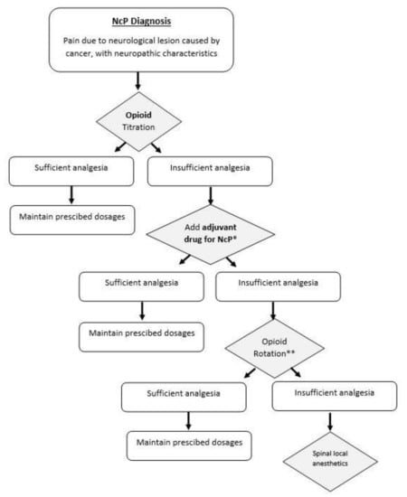 The pharmacological strategy for NCP treatment when analgesia is not satisfactory with the use of opioid medications is only weakly supported by clinical trials, and robust evidence is lacking. Most available studies have low quality of evidence often with unclear randomization procedures and heterogeneity, which make the pooling of the results not possible [83]. Based on the existing guidelines, but also on clinical experience, in our clinical practice the first step in for an appropriate management of NCP is the correct identification of this pain type, according to the pre-existing mentioned criteria [17]. After diagnosis of NCP, titration of monotherapy with opioids is attempted and maintained if it provides sufficient analgesia. In the case of insufficient analgesia and the coexistence of sensory symptoms, adjuvant drugs for NCP can be prescribed. Current evidence suggests benefits mainly using adjuvant drugs such as gabapentinoids, mainly gabapentin and pregabalin, and antidepressants such as amitriptyline [23,38]. The combination therapy is maintained if it provides adequate analgesia; otherwise, opioid rotation can be attempted. Methadone is usually the drug of choice although requiring cautions about its titration and dose conversion [60]. If pain persists, additional pain management approaches can be implemented, such as local spinal anesthetics. These steps have been summarized in Figure 1.