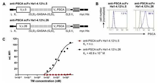 Functional characterization of VLc.5 and VLc.26 of the human anti-PSCA IgG1 Ab Ha1-4.121. (A) Schematic representation of the anti-PSCA scFvs Ha1-4.121 containing either the VLc.5 or VLc.26. C-terminally recombinant Abs were equipped with the E5B9-, myc- and hexahistidine-tag (His-tag). L, leader peptide; VL, variable domain of the light chain; VH, variable domain of the heavy chain; scFv, single-chain fragment variable. (B,C) Flow cytometry data of anti-PSCA scFv Ha1-4.121c.5 and anti-PSCA scFv Ha1-4.121c.26 using PC3-PSCA cells. After incubation of tumor cells with (B) 20 ng/µL or (C) increasing scFv concentrations, the binding of the respective scFv was detected via primary anti-La(5B9) mAb, and secondary goat anti-mouse IgG-PE Ab. (B) Histograms show percentage of stained cells (blue graphs) in comparison to the respective negative controls (black graphs). (C) For calculation of the apparent affinity of the scFvs towards PSCA, Ab concentrations were plotted against the relative mean fluorescence intensity (rel. MFI) values. Results of one representative experiment is shown; n.c., not calculable.