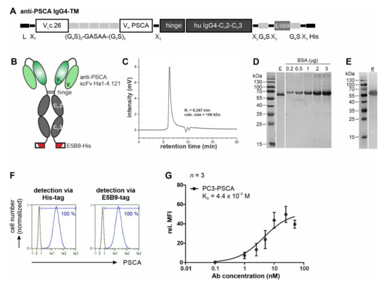 Biochemical characterization and binding properties of the recombinant anti-PSCA IgG4-TM. (A) The anti-PSCA scFv Ha1-4.1.2c.26 was fused to the hinge and Fc-region of human IgG4 molecules via flexible peptide linkers. In addition, the E5B9- and His-tag were fused to the C-terminus of the recombinant Ab. (B) The anti-PSCA IgG4-TM forms homodimers that are covalently connected via disulfide bounds in the hinge region. L, leader peptide; VL, variable domain of the light chain; VH, variable domain of the heavy chain; CH, constant domain of the heavy chain; scFv, single-chain fragment variable. (C–E) After purification via protein A affinity chromatography, the elution fraction (E) containing the anti-PSCA IgG4-TM was analyzed via (C) SE-HPLC and (D,E) SDS-PAGE. (D) Proteins (TM monomer, Mw = 56 kDa) separated via SDS-PAGE were stained via Quick Coomassie® Stain solution to determine TM purity and concentration by means of a BSA standard. (E) After Western blotting, the anti-PSCA IgG4-TM was detected via its C-terminal His-tag. Uncropped WB in Figure S1. (F,G) Binding activity of the anti-PSCA IgG4-TM was evaluated by flow cytometry. PC3-PSCA cells were incubated with (F) 20 ng/µL or (G) increasing TM concentrations. Binding was detected via anti-His-PE Ab or primary anti-La(5B9) mAb, and secondary PE goat anti-mouse IgG (minimal x-reactivity) Ab. (F) Histograms show percentage of stained cells (blue graphs) in comparison to the respective negative controls (black graphs). (G) For calculation of affinity towards PSCA, Ab concentrations were plotted against the relative mean fluorescence intensity (rel. MFI) values. Results of three independent experiments are shown (rel. MFI ± SEM).