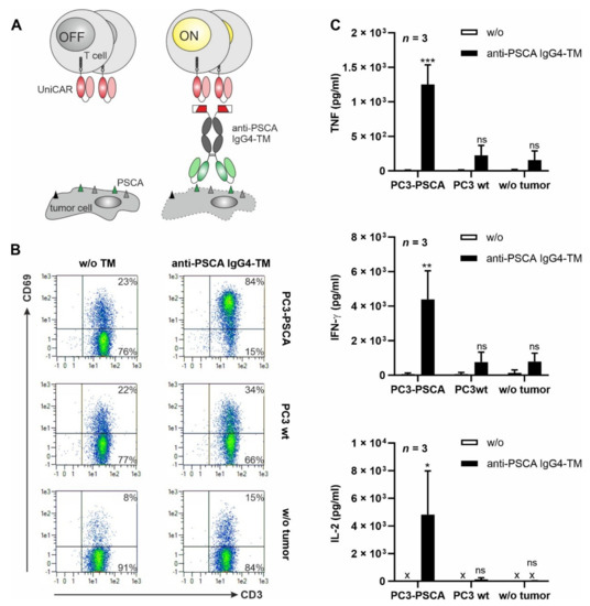 To prove that the novel anti-PSCA IgG4-TM can be utilized as a TM in the UniCAR system, various co-cultivation assays were conducted. UniCAR T cells were incubated with PSCA-positive or PSCA-negative tumor cells in the presence or absence of the novel TM. As exemplified by the upregulation of the early activation marker CD69, UniCAR T cells were activated in a target-specific and strictly TM-dependent manner (Figure 3B and Figure S2A). Upon anti-PSCA IgG4-TM mediated cross-linkage with PC3-PSCA tumor cells, UniCAR T cells were engaged for significant secretion of the pro-inflammatory cytokines TNF and IFN-γ, as well as the growth-promoting cytokine IL-2 (Figure 3C and Figure S2B