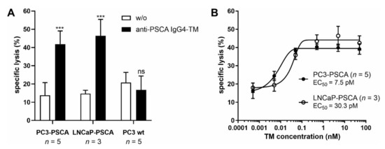 ). As shown in Figure 4A, the TM-mediated cross-linkage of tumor and UniCAR T cells finally resulted in specific tumor cell lysis. Neither in absence of tumor cells nor in the presence of PSCA-negative PC3 wt cells, an unspecific release of cytokines or tumor cell killing could be observed. As depicted in Figure 4B, the anti-PSCA IgG4-TM successfully engaged UniCAR T cells for efficient tumor cell killing with an EC50 (half-maximal effective concentration) value of 7.5 or 30.3 pM for PC3-PSCA or LNCaP-PSCA cells, respectively. According to previously published data, the anti-PSCA IgG4-TM showed comparable killing efficiency to other PCa-specific or IgG-based TMs [34,36,41,52].