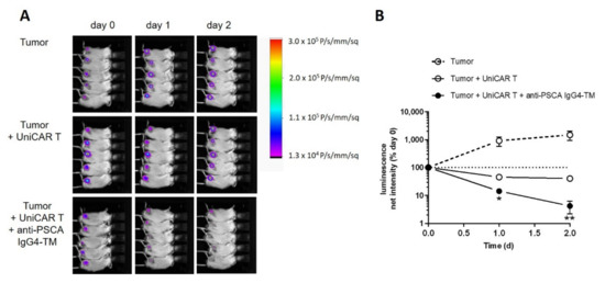 Evaluation of the immunotherapeutic potential of the anti-PSCA IgG4-TM in experimental mice. Immunodeficient NXG mice were subcutaneously injected with PC3-PSCA/PSMA Luc+ alone or in combination with UniCAR T cells in the absence or presence of the anti-PSCA IgG4-TM. (A) Luminescence images for each mouse after day 0, day 1, and day 2 are shown. (B) Quantitative analysis of luminescence signals. For each mouse, net intensities (P/s/mm2) were normalized to net intensities measured at day 0. Mean luminescence net intensities ± SEM for five mice per group are shown (* p < 0.05, ** p < 0.01, compared to the control group “Tumor + UniCAR T”, Student’s t-test).