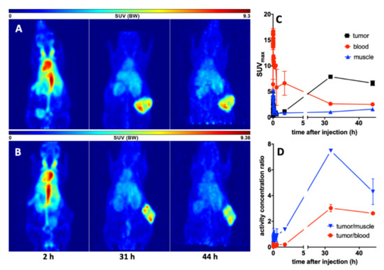 PET experiments showed a high contrast tumor accumulation of the 64Cu-TM. The intact 64Cu-TM increasingly accumulated in the tumor with maximum enrichment after 31 h. Activity slowly cleared from the blood and after two days was only found in the blood and the tumor resulting in optimal target-to-background ratios that did not significantly change over time. The absence of activity accumulation in other organs, including excretory organs and the reticuloendothelial system, proves TM stability, absence of TM aggregates, and excretion of radioactive metabolites. Although the physical half-life of the 64Cu only allows imaging over two days, our data clearly underline suitability of the TM for high contrast PET imaging of PSCA-expressing PCa.