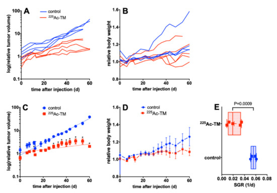 Tumor growth kinetics were evaluated from the growth curves of individual tumors. Starting point was the time of injection of DOTAGA-TM (control) or the 225Ac-TM. The tumor growth kinetics were evaluated by an equation that describes the growth with a constant doubling time (DT) Y = Y0·exp(k·t). Y0 is the Y value when t (time) is zero. It is expressed in the same units as Y; k is the rate constant, expressed in reciprocal of the t axis time units. If t is in days, then k is expressed in inverse days. k is equal to the SGR. The DT is calculated as DT = ln(2)/SGR [50]. The tumor SGR were compared by an unpaired t-test. Statistical significance was determined using the Holm-Sidak method, with alpha = 0.05, without assuming a consistent SD. The specific tumor volumes, calculated as Y/Y0, were also compared for each time point with t-test. The statistical calculations were performed using GraphPad Prism version 7.00 for Mac OS X, GraphPad Software (La Jolla, CA, USA.)