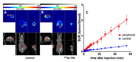 As mice were injected with a low amount of activity (5 kBq 225Ac-TM/animal corresponding to 0.15 µg TM/mouse or 1.3 pmol TM/mouse), the visualization of 225Ac-TM gamma-emitting isotopes in the mice by SPECT was not possible [51]. However, the biodistribution and kinetics of the 225Ac-TM is expected to be very close to the biodistribution of the 64Cu-TM.