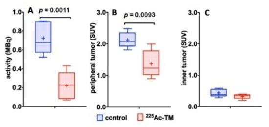 The quantitative comparison of the 18F-activity distribution in the control and 225Ac-TM group showed a significant decrease of the activity amount (Figure 10A) in the total tumor, and a significant decrease of the activity concentration in the peripheral tumor (Figure 10B). The activity concentrations (SUV) in the central, low perfused, and necrotic part of the tumors (Figure 10C) did not differ between both groups.