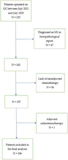After receiving institutional review board approval (KE—0254/331/2018), we collected data from the database of patients diagnosed with GC treated with gastrectomy from 1 July 2012 to 31 July 2020 at the Department of Oncological Surgery of the Medical University of Lublin, Poland. The initial date of patients’ recruitment was set due to the standardisation of the NAC with 5-Fluorouracil and platinum derivatives, reflecting the current evidence-based clinical guidelines for GC [2,28,29]. The preoperative staging, evaluation of the patient’s general condition and treatment plan were carried out by the multidisciplinary team. A ypTNM stage of the disease was established according to the 8th edition of the American Joint Committee on Cancer (AJCC) [30]. In the present study, we included patients with histologically confirmed GC who underwent multimodal treatment based on NAC and surgical resection. We excluded patients in clinical stages I and IV, without NAC or gastrectomy and with adjuvant radiotherapy. One hundred six patients were eligible for the final analysis. The flow chart of the study is shown in Figure 1.