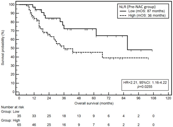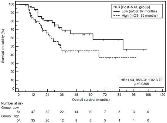 Moreover, high NLR in the post-NAC group was associated with a significantly higher risk of death (mOS: 35 vs. 87 months; HR = 1.94; p = 0.0368; Figure 4).