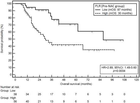 Similarly, elevated PLR in the pre-NAC group was associated with a significantly higher risk of death (mOS: 30 vs. 87 months; HR = 2.89; p = 0.0034; Figure 3).
