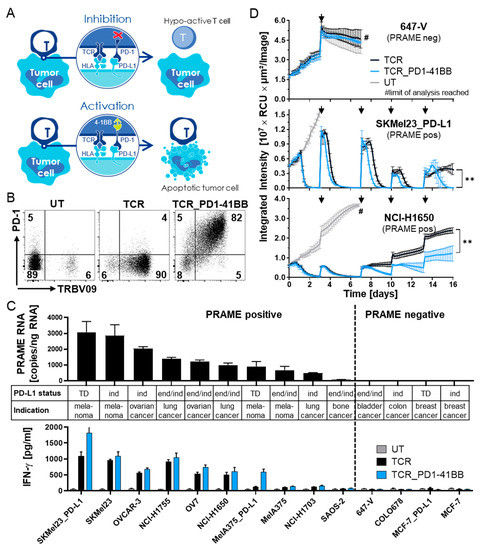 The following supporting information can be downloaded at: https://www.mdpi.com/article/10.3390/cancers14081998/s1, Figure S1. Cytotoxicity of TCR-Ts, with or without PD1-41BB, against red fluorescently labelled 3D tumor cell spheroids was monitored over 16 days using the IncuCyte S3® device. T cells were re-challenged with fresh spheroids on day 3, 7, 10 and 13 indicated by black arrows. PD-L1-transduced SKMel23 (PRAME-positive), endogenously PD-L1-expressing NCI-H1650 (PRAME-positive) were used as target cells. For day 3, 7, 10 and 13 pictures before and after adding fresh tumor cell spheroids are shown., Figure S2. Variant peptides were loaded onto T2_PD-L1 cells at a peptide concentration of 10-6 and recognition by TCR-Ts without or with PD1-41BB was tested. UT T cells served as negative control. The specific PRAME-SLL peptide and an irrelevant peptide were used as controls. For read-out, supernatants were harvested after 20 h and analyzed by IFN-γ ELISA. The data represent means of duplicates. Peptides that were recognized above the background (200 pg/mL) are marked. Experiments were performed with T cells derived from four different donors; data with cells from one representative donor are shown.