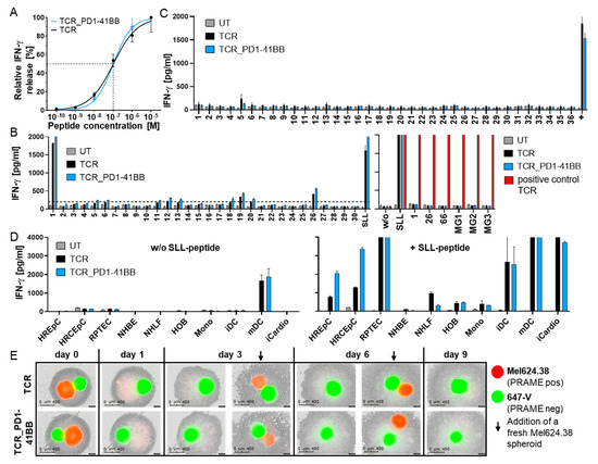 Co-expression of PD1-41BB does not change the in vitro safety profile of the lead PRAME-SLL-TCR. (A) Functional avidity of CD8+ TCR-Ts, with or without PD1-41BB, following stimulation with PD-L1-transduced T2 cells loaded with graded amounts of PRAME peptide (10−10 M–10−5 M). Cells were cultured at an E:T ratio of 1:1. The graph shows nonlinear regression curves of relative IFN-γ release. Peptide concentration needed for half maximal IFN-γ secretion is indicated by the dashed line. The data represent means of duplicates measured at each peptide concentration. (B) Left part: The recognition of 191 peptides with high sequence homology with the specific PRAME-SLL peptide by CD8+ TCR-Ts with or without PD1-41BB was analyzed. Peptides were loaded onto T2_PD-L1 cells at a concentration of 10−6 M. IFN-γ release data for 30 peptides are shown as an example; data for all peptides are shown in Figure S2. Right part: PRAME-negative, PD-L1-expressing SNB-19 cells were transfected with RNA constructs encoding either a midigene (~400 bp) coding for single peptides (SLL, 1, 26, 66) or minigene (~90 bp per peptide) constructs (MG) coding for up to five variant peptides and co-cultured with effector cells. All constructs included an epitope recognized by a positive control TCR. UT T-cells served as negative control. For read-out, supernatants were harvested after 20 h and analyzed by IFN-γ ELISA. The data represent means of duplicates. (C) IFN-γ released by CD8+ TCR-Ts with or without PD1-41BB co-cultured with 36 LCLs covering frequent HLA-A, -B, and -C alleles. UT CD8+ T-cells served as negative control, and PRAME-SLL-peptide-loaded HLA-A*02:01 positive LCLs were used as positive control. (D) IFN-γ released by CD8+ TCR-Ts with or without PD1-41BB co-cultured with normal cells derived from critical healthy tissues. As positive controls, cells were loaded with PRAME SLL-peptide. HREpC: human renal epithelial cells, HRCEpC: human renal cortical epithelial cells, RPTEC: renal proximal tubule epithelial cells, NHBE: normal human bronchial epithelial cells, NHLF: normal human lung fibroblasts, HOB: human osteoblasts, Mono: monocytes, iDC: immature dendritic cells, mDC: mature dendritic cells, iCardio: iCell Cardiomyocytes. The data represent means of duplicates. (E) Cytotoxicity of CD8+ TCR-Ts with or without PD1-41BB against PRAME-positive PD-L1-negative (red) and PRAME-negative PD-L1-positive (green) 3D tumor cell spheroids. Fresh PRAME-positive Mel624.38 spheroids (red) were added to the co-cultures on days 3 and 6, indicated by black arrows. For days 3 and 6 pictures, before and after adding fresh tumor cell spheroids are shown. Experiments in A–E were repeated at least three times with T-cells derived from different donors; data with cells from one representative donor are shown.