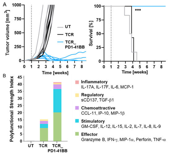 TCR-Ts co-expressing PD1-41BB reject tumor cells in vivo and show a superior poly-cytokine profile. (A) 5 × 106 MelA375_PD-L1 cells were injected s.c. into immunodeficient (NOD/Shi-scid/IL-2Rγnull) mice. Mice were treated on day seven either with 10 × 106 PRAME-TCR-positive CD8+ TCR-Ts with (7 mice) or without (7 mice) PD1-41BB (14 × 106 cells in total per mouse) or 14 × 106 UT T-cells (6 mice), and tumor growth (left panel) and survival (right panel) was followed for 60 days. Statistical significance between TCR and TCR_PD1-41BB was calculated using the log-rank Mantel–Cox test (p = 0.0003, ***). (B) Co-cultures of MelA375_PD-L1 cells and TCR-Ts, with and without PD1-41BB, were performed in poly-L-lysine pre-coated 24 well plates. After 20 h, T-cells were harvested, enriched for CD8 expression by MACS, and applied onto IsoCode Chips. Polyfunctional strength index (PSI), which combines the analysis of identity and quantity of secreted cytokines/proteins, is depicted. Analysis is based on all cytokines/proteins which were detected by the Single-Cell PF Strength Panel kit designed for 32 different proteins. Experiment was repeated two times with T-cells derived from different donors. Data from one representative donor are shown.