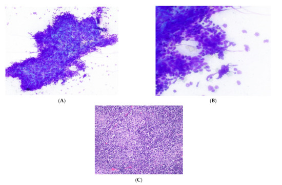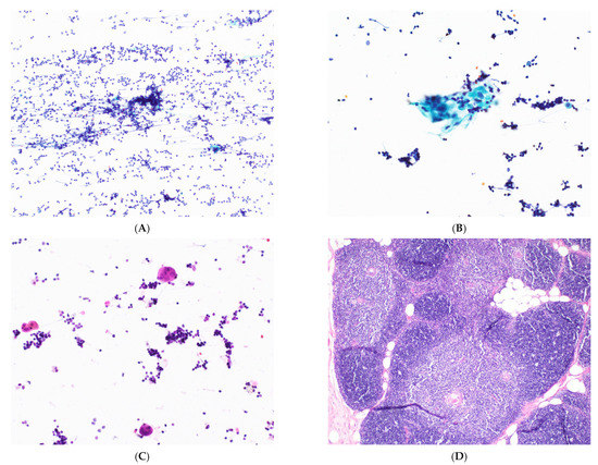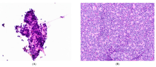 Aspirates of thymic carcinoid tumors show loose clusters or small strands of epithelial cells. The cells are uniform, small, and round to ovoid with scant cytoplasm and finely granular “salt and pepper” chromatin (Figure 9) [1]. Atypical nuclear features, including molding and hyperchromasia, are not observed. Necrosis and mitotic count, which are used to distinguish typical and atypical carcinoid tumors histologically, cannot be reliably used to distinguish these two entities on aspirates [1,22]. Carcinoid tumors can be easily misclassified due to their rarity and overlapping features with other entities. For example, pyknotic apoptotic nuclei can mimic lymphocytes, and the clustering of carcinoid cells resembles thymoma epithelial cells [54].