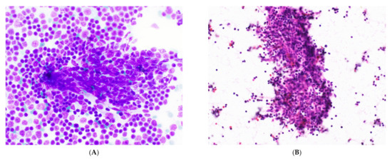 The cytological features in aspirates from thymic carcinoma vary by subtype, typically appearing, like their morphological analogs, elsewhere in the body. Squamous cell carcinoma, the most common subtype of thymic carcinoma, is also the most thoroughly described histological subtype in the cytology literature. This tumor shows epithelial cells that are overtly malignant, with enlarged nuclei, coarse chromatin, discrete nucleoli, and a moderate amount of cytoplasm (Figure 7) [1,22]. Thymic carcinoma smears frequently feature a necrotic background. However, necrosis can also be seen in thymoma aspirates, which may obscure non-malignant thymic epithelial cells, resulting in the misinterpretation of a thymoma as thymic carcinoma [10,37,38,39].