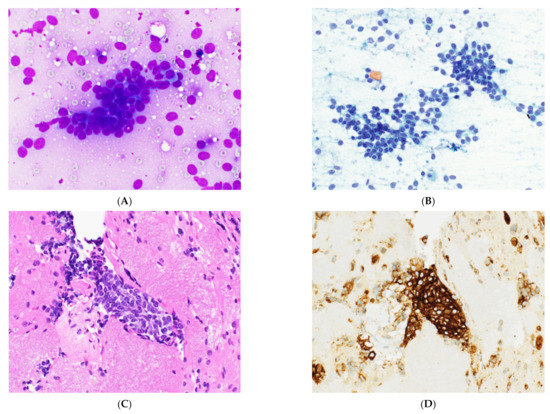 Radiological information is often needed for an accurate diagnosis of mediastinal masses. In cases of thymic carcinoma, where cytological findings can be identical to those for carcinomas from other organs, a metastatic lesion should be radiologically excluded and ancillary tests should aid the diagnosis (Figure 10) [22,31,77]. While most thymic epithelial tumors occur in the anterior mediastinum, recurrent and metastatic tumors can present anywhere in the mediastinum, pleura, lungs, and other extrathoracic locations [78,79,80,81]. Additionally, ectopic thymomas have been reported in the lungs, middle mediastinum, thyroid, and other extramediastinal locations [10,82]. Due to their relative rarity, they may be misinterpreted if thymic neoplasms are not considered in the differential diagnosis.