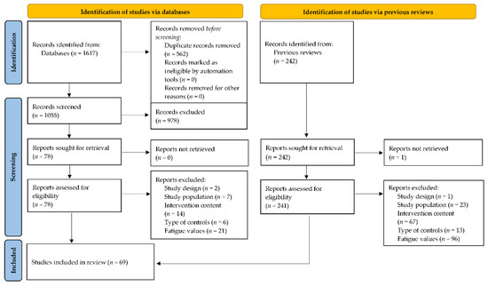 Our systematic search yielded 18 reviews including psychosocial interventions [18,58,59,60,61,62,63,64,65], mindfulness-based interventions [17,33,35,66,67,68,69], or different intervention types [15,16]. The German guidelines regarding yoga interventions were based on three reviews [15,19,70] and 12 additional studies. Overall, these reviews included 242 studies. Our additional search of databases for recent studies generated 1055 records that were initially screened. Of these, 978 were excluded based on information in the title or abstract. Overall, 318 studies were screened for eligibility by reading the full article. Articles were excluded if they did not meet our inclusion criteria because of study design (n = 3), study population (n = 30), intervention content (n = 81), type of controls (n = 19), or fatigue values (n = 117).