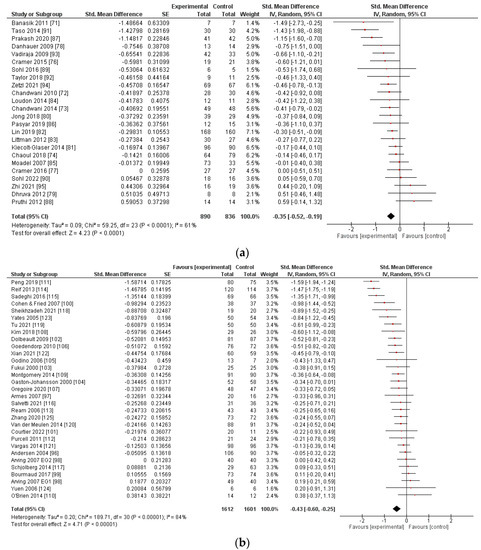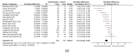 All three intervention types showed an overall significant reduction in CRF (Figure 2). The largest effect was observed for mindfulness-based interventions with an SMD of −0.73 (95% CI −0.98, −0.49, p < 0.001, n = 15 studies). Psychosocial interventions yielded a significant SMD of −0.43 (95% CI −0.60, −0.25, p < 0.001, n = 31). A significant effect was also observed for yoga interventions with an SMD of −0.35 (95% CI −0.52, −0.19, p < 0.001, n = 24).