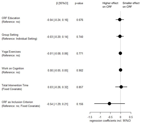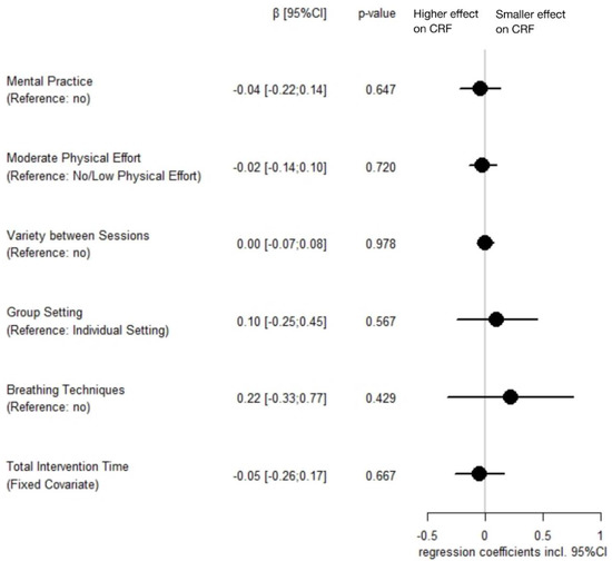 Similarly, in mindfulness-based interventions, no significant differences in effects on CRF by intervention characteristics emerged. We are only aware of one review that conducted subgroup comparisons in mindfulness-based interventions: Duong and colleagues found a trend for greater effectiveness of mindfulness-based interventions that included only study participants with pre-existing CRF [155]. We used CRF as an inclusion criterion as a fixed covariate, and although it was not significant in multimodel analysis, it had the strongest regression coefficient of all included variables. Of course, this may be due to a statistical regression-to-the-mean effect, since there is more room for improvement in case of higher initial values. Nonetheless, for future mindfulness-based interventions, it seems promising to analyze whether mindfulness may be more beneficial for treating existing CRF than for preventing its onset. Our analyses did not identify higher effectiveness on CRF of mindfulness-based interventions applying working with cognition in accordance with the mindfulness-based cognitive therapy [32]. However, the database is still small. Thus, given our finding of advantages of using cognitive techniques in psychosocial interventions and given that the effects of mindfulness-based interventions work primarily through emotional and cognitive processes [162,163], increased consideration of how to integrate cognitive techniques into mindfulness-based approaches may nevertheless be promising.