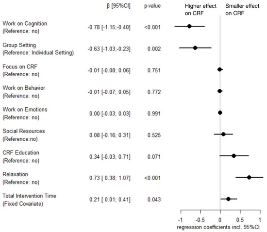 In contrast to a recent review that highlighted an advantage of the general cognitive-behavioral approach for reducing CRF [147], we analyzed the intervention elements’ work on cognition and work on behavior separately. In doing so, we allowed for a wide range of possible behavioral modification techniques, which included goal setting and problem-solving but also the promotion and scheduling of (physical) activity, which is closely related to CRF [148,149]. This approach resulted in only 3 of the 31 interventions not applying work on behavior which may explain the non-significant result of this intervention element in our analysis. However, splitting the behavioral techniques would have led to overparameterization. If more psychosocial interventions sufficiently expand the database in the future, a separate analysis of behavioral techniques, preferably based on the established taxonomy of behavior change techniques [150], would certainly be useful.
