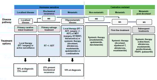 MDT therapy is currently a matter of debate. The MDT hypothesis is that the treatment of M1 lesions could prevent the spread of other metastatic lesions and thus improve survival. This could change the paradigm for M1 disease from a palliative to a potentially curable approach in selected patients [47]. Therefore, it includes patients with a low synchronous M1 burden and, more frequently, metachronous deposits after radical therapy, including nodal and bone metastases, to delay the initiation of ADT or prolong the time to progression.