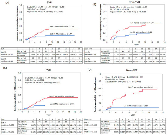 We performed univariate Cox regression analysis and found that let7b (median: ≥−1.44 vs. <−1.44, crude HR = 0.48, 95% CI: 0.21–0.67, p = 0.0007), let7d (median: ≥−1.90 vs. <−1.90 crude HR = 0.35, 95% CI: 0.18–0.61, p = 0.0002), let7i (median: ≥−1.696 vs. <−1.696 crude HR = 0.22, 95% CI: 0.18–0.61, p < 0.0001), dynamic change (Δ) in let-7d levels (median ≥0.17 vs. <0.17 crude HR = 0.42, 95% CI: 0.23–0.73, p = 0.0022), and Δlet-7e levels (median: ≥0.15 vs. <0.15 crude HR = 0.37, 95% CI: 0.20–0.65, p = 0.0005) were significant predictors of HCC. We stratified the patients by SVR status and adjusted by age, sex, HCV genotype, FIB-4 ≥3.25, only let7b (median: ≥−1.44 vs. <−1.44, adjusted HR = 0.30, 95% CI: 0.08–0.89, p = 0.0296) and let7i (median: ≥−1.696 vs. <−1.696, adjusted HR = 0.31, 95% CI: 0.08–0.94, p = 0.0372) (Table 4). In the non-SVR group, let7i (median: ≥−1.696 vs. <−1.969, adjusted HR = 0.09, 95% CI: 0.01–0.45, p = 0.0022) showed an 11-fold decreased cumulative probability of HCC development (Figure 1). Together, the findings suggest that let-7i is an independent factor for HCC development in patients with CHC.
