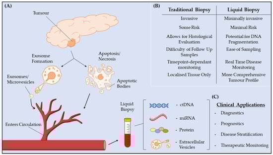 Liquid biopsies for PDAC. (A) Mechanisms through which various tumor biomarkers enter circulation. Extracellular vesicles, such as exosomes, microvesicles, and apoptotic bodies bud off from tumor cells and enter circulation. Circulating tumor (ct) DNA, miRNA and proteins are secreted from tumor cells or released through cellular apoptosis and necrosis. (B) Comparison between liquid and traditional biopsies. (C) Potential clinical applications of liquid biopsy-based biomarkers in PDAC.