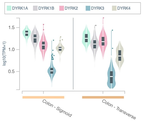 DYRKs are expressed ubiquitously in all human tissue, and they have low tissue specificity [11]. We used the GTEx portal web tool to investigate the expression level of DYRKs in normal colon tissues in two anatomical parts: the sigmoid and the transverse colon. As represented in Figure 1, DYRK1A was found to have a higher expression level in colon tissues compared to other DYRKs in both anatomical parts of the colon. DYRK1B and DYRK2 showed intermediate expression levels, whereas DYRK3 and DYRK4 were found to have low expression in colon tissues.