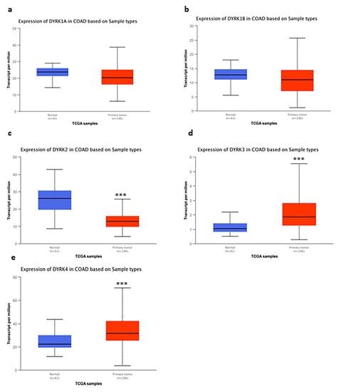 DYRKs were shown to be implicated in various human diseases, including cancer [10]. However, no study investigated the role of DYRKs specifically in colorectal cancer. In this study, using various web tools and large RNA sequence datasets derived from cancer patients, we analyzed specific expression levels of all DYRK family members in relation to CRC clinical features and patient survival outcome.