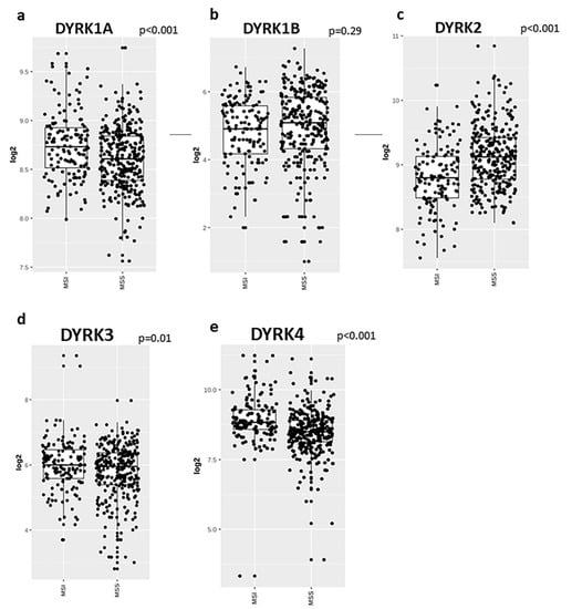 CRC are classified into major pathological molecular subtypes. The first group is microsatellite instable group (MSI) due to defects in mismatch repair (MMR) genes (16%) or DNA polymerase epsilon proof reading (3%). The second group is microsatellite stable (MSS) and represents 84% of CRC cases. MSS CRC are characterized by high rate of somatic mutations in several genes such as APC, TP53, PIK3CA, KRAS and SMAD4 [47]. To study DYRK members’ gene expression in the different tumor subtypes, we used the web-based tool GENT2 [40]. Comparing the MSI and MSS subtypes, DYRK1A, DYRK3 and DYRK4 (Figure 4a,d,e) are all significantly higher in MSI, whereas DYRK2 is significantly higher in MSS (Figure 4c). For DYRK1B, there were no significant differences in its expression in MSI and MSS (Figure 4b).