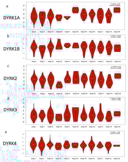 Using GEPIA2, we investigated the level of DYRKs member in different CRC stages. As shown in Figure 5, DYRK1A is significantly upregulated in late tumor stages from IIIA to IVB (Figure 5a). DYRK1B expression did not show any significant differences among CRC stages (Figure 5b). Similarly, class 2 DYRKs expression did not have any significant differences in CRC stages. This indicates that among DYRKs members, only DYRK1A is overexpressed in later tumor stages of CRC patients and suggests that DYRK1A may play a role in the advanced stages of the disease.
