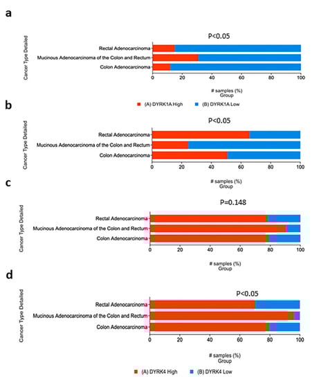 DYRKs status in CRC histological subtypes. PAN TCGA adenocarcinoma data set were used from cBioPortal. Samples were filtered based on mRNA z-score relative to normal samples (Log RNAseq V2 RSEM). Samples with mRNA z score = or >1 were considered high, and samples with mRNA z score <1 were considered low. (a) DYRK1A, (b) DYRK1B, (c) DYRK3 and (d) DYRK4.