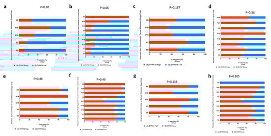 DYRKs status in metatsais and lymph node stages in CRC. PAN TCGA adenocarcinoma data set was used from cBioPortal. Samples were filtered based on mRNA z-score relative to normal samples (Log RNAseq V2 RSEM). Samples with mRNA z score = or >1 were considered high, and samples with mRNA z score <1 were considered low. (a) Lymph node stage for DYRK1A, (b) lymph node stage for DYRK1A, (c) metastasis stage for DYRK1B, (d) lymph node stage for DYRK1B, (e) metastasis stage for DYRK3, (f) lymph node stage for DYRK3, (g) metastasis stage for DYRK4 and (h) lymph node stage for DYRK4.