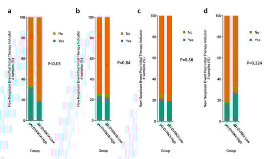 New newplasm event indicator. PAN TCGA adenocarcinoma data set were used from cBioPortal. Samples were filtered based on mRNA z-score relative to normal samples (Log RNAseq V2 RSEM). Samples with mRNA z score = or >1 were considered high, and samples with mRNA z score <1 were considered low. (a) DYRK1A, (b) DYRK1B, (c) DYRK3 and (d) DYRK4.