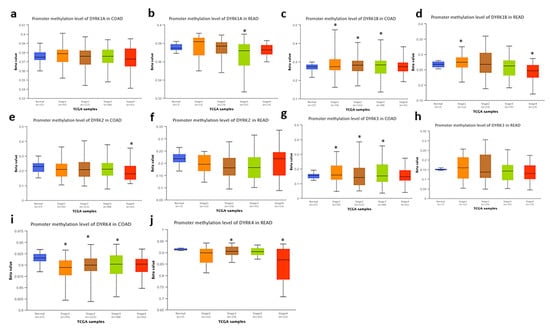 Promotor methylation level of DYRKs in COAD and READ. TCGA data set was obtained from UALCAN web tool. (a,b) DYRK1A, (c,d) DYRK1B, (e,f) DYRK2, (g,h) DYRK3 and (i,j) DYRK4. * p < 0.05.