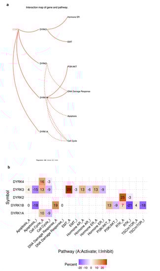 Cancer pathway activity of DYRKs predicted from GSCALite web tool. (a) Predicted pathways in COAD. (b) Predicted pathways in global cancers.