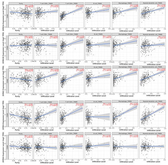 Because we found differential DYRK members expression in MSI and MSS subtypes and the fact that these two CRC subtypes exhibit different immune cells abundance in the tumor microenvironment [47], we used TIMER 2 web tool to explore potential correlation between DYRKs expression and tumor infiltrating immune cells in CRC.