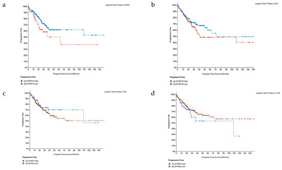 Progression-Free Survival. Pan TCGA adenocarcinoma data set were used from cBioPortal. Samples were filtered based on mRNA z-score relative to normal samples (Log RNAseq V2 RSEM). Samples with mRNA z score = or >1 were considered high and samples with mRNA z score <1 were considered low. (a) DYRK1A, (b) DYRK1, (b,c) DYRK3 and (d) DYRK4.